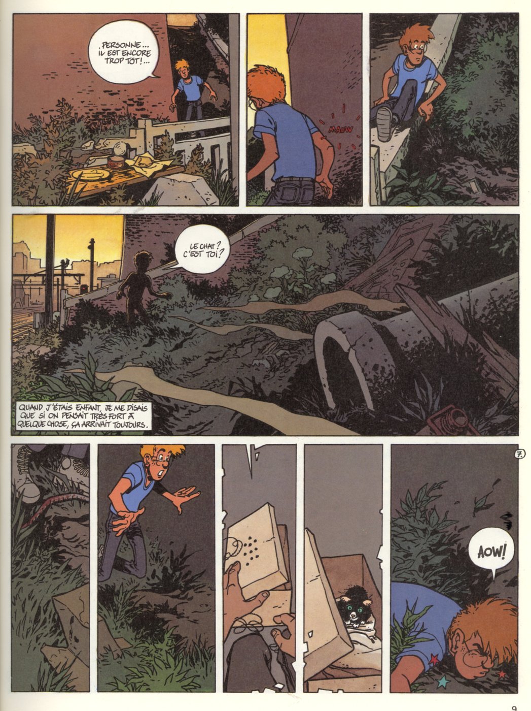 Avec Bom au scénario, Broussaille va vivre quelques albums très remarqués dont La nuit du chat où notre héros part à la recherche de son félin domestique à travers la nuit bruxelloise, croisant divers personnages hauts en couleur. L’occasion pour lui de réfléchir sur le sens de sa vie. Même si je n’aimais pas trop le virage réaliste du graphisme, j’ai toujours été fasciné par le concept et la façon dont Pé avait abordé ce périple nocturne – marcher la nuit dans la ville m’a toujours inspiré.