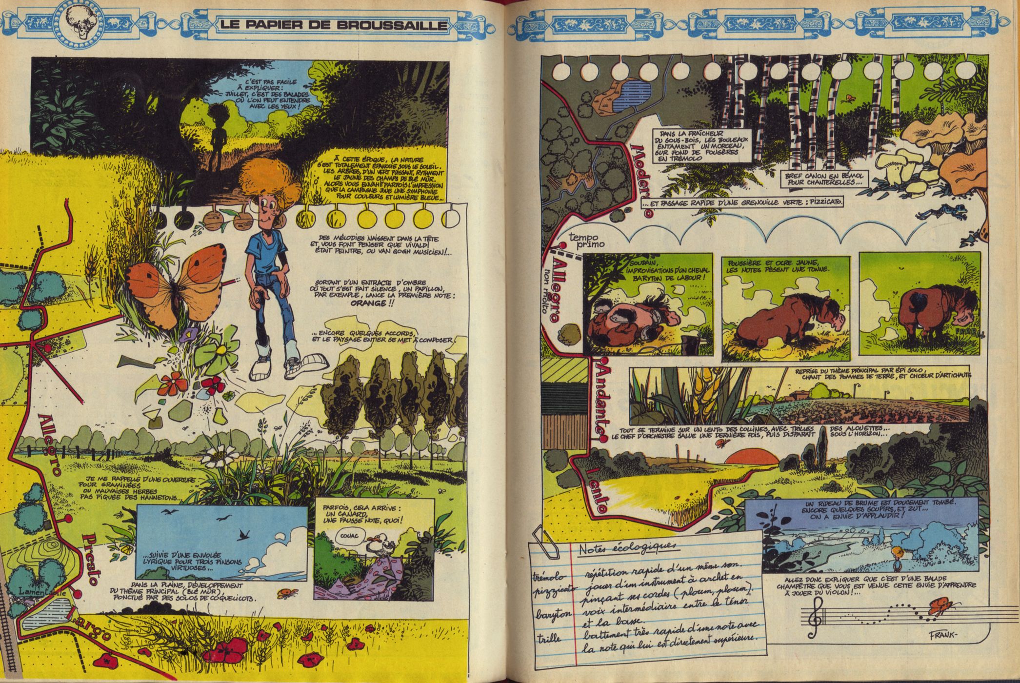 Frank Pé va rapidement imposer son univers : la Nature et la vie animale – et en corollaire, l’écologie. Dans le beau journal Spirou, les animaux c’étaient Bill en chien pensant ou l’univers de Macherot. Pour Pé, la Nature ça ne supporte pas les approximations. C’est une Nature aimée, observée et magnifiée. Ça va passer par les fameux Papier de Broussaille, des chroniques courtes sur des thèmes variés et je suis ravi d’avoir dégotté cette histoire en deux planches dans laquelle Broussaille déambule à la travers la campagne. Pé montre un sens de l’observation et du rendu digne de Franquin.