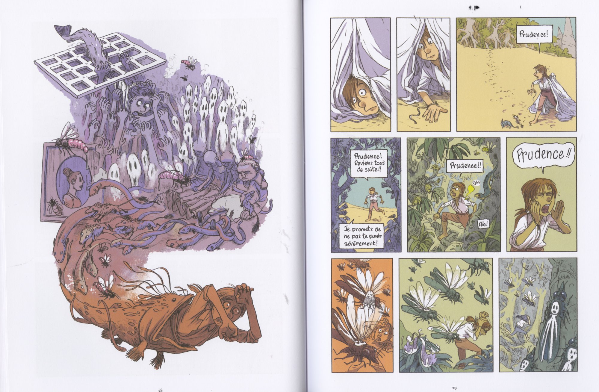 Lorsqu’il m’arrive de réfléchir à des projets d’albums éventuels (un vrai luxe pour moi en ce moment), je me demande comment adapter mon goût personnel aux tendances éditoriales actuelles (il faut bien convaincre les éditeurs que l’on ne va pas faire des aventures à l’ancienne, bon, sauf peut-être chez Paquet). Tehem aborde des thématiques très contemporaines avec une originalité rafraîchissante. Émilien est l’exemple type du mâle blanc imbu d’une supériorité bien relative et il va tomber de haut une fois plongé dans un univers où il n’est pas reconnu pour ce qu’il croit être. En opposition, l’esclave Prudence va trouver sa place grâce à ses compétences. Ils se retrouvent tous les deux naufragés sur une île aux habitants, plantes et animaux étranges, un biotope où il faudra s’adapter. Pour le coup, j’ai été impressionné. Tehem développe, en plus de deux peuplades géantes, tout un écosystème avec plantes et insectes zarbis mais cohérents. Je rajoute que l’approche narrative, qui rejoint quelque peu son Quartier Western avec une narration à la Rashōmon, qui raconte une même histoire vue par des protagonistes différents.