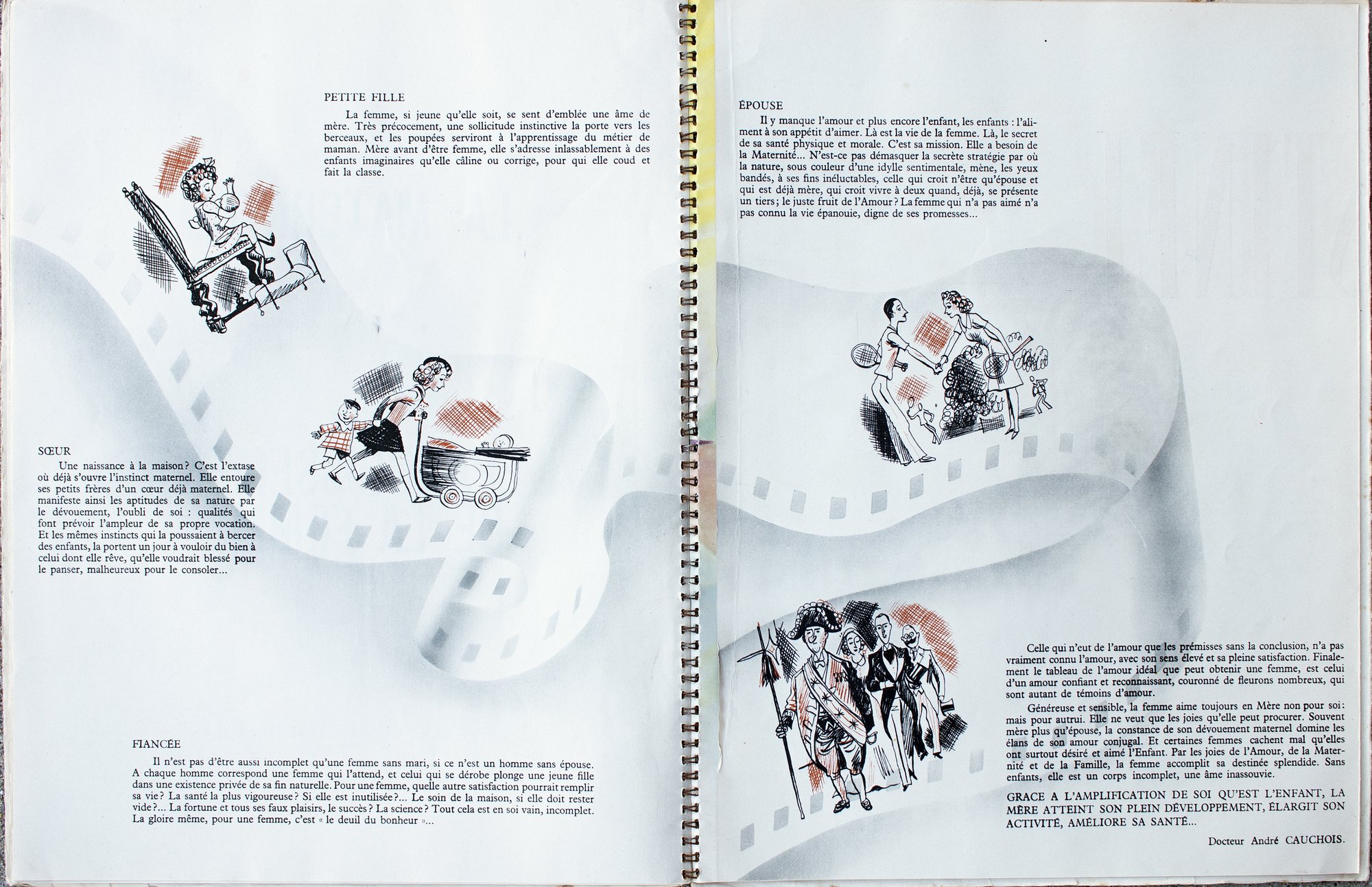 En 1942, le Commissariat général à la Famille publie un ouvrage de propagande nataliste, destiné aux médecins, intitulé La vie en fleur (ce qui ne veut rien dire, au passage). Beuville réalise plusieurs illustrations pour illustrer le propos – que l’on peut résumer facilement par « les femmes sont faites pour procréer et rien ne pourrait leur apporter plus de joie que de pondre des chiards ».
