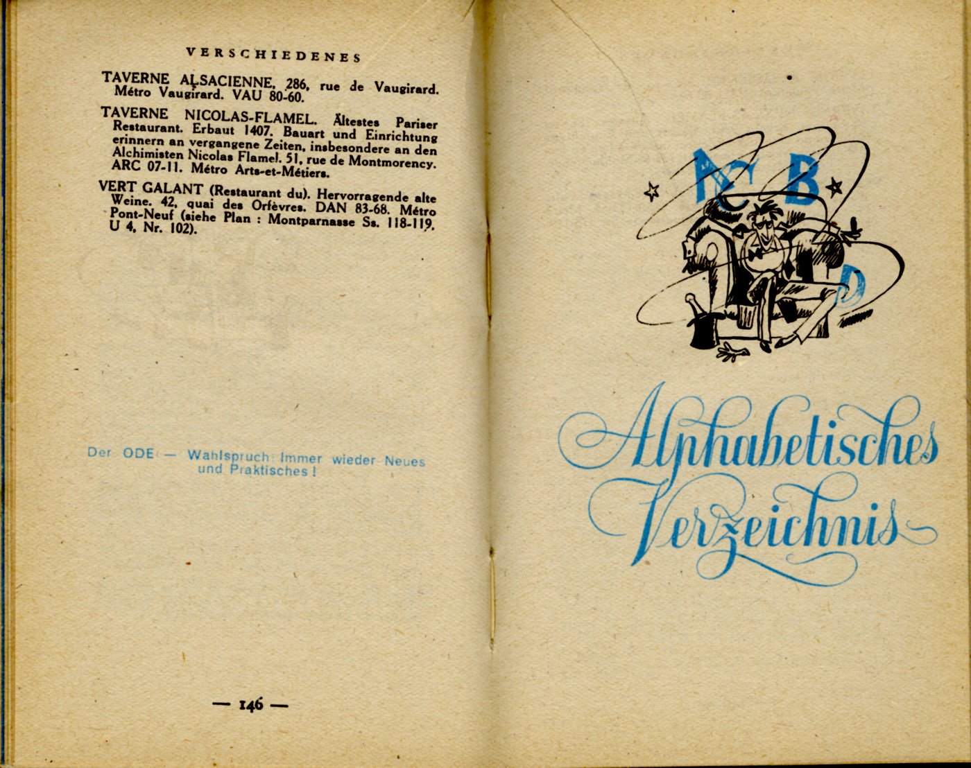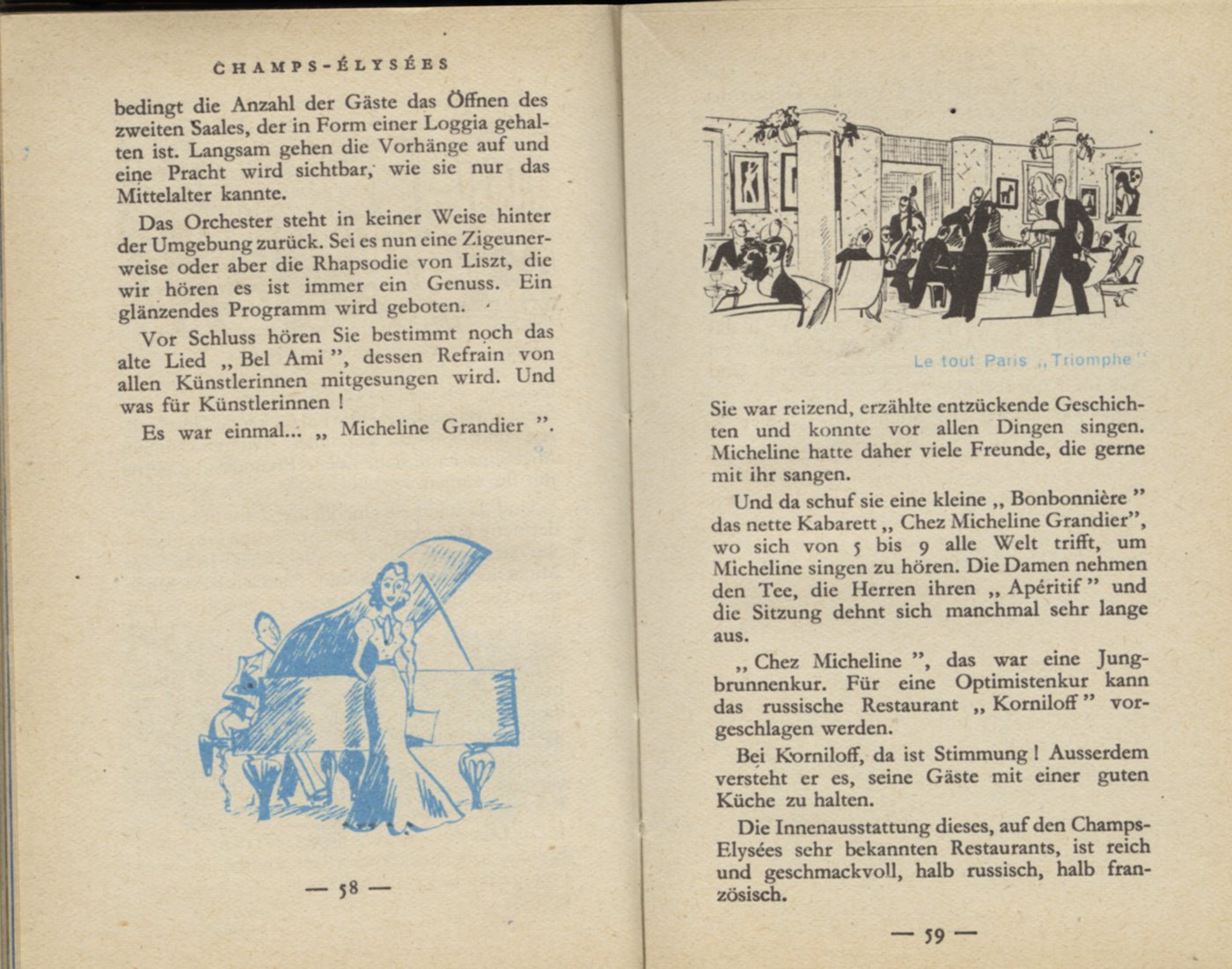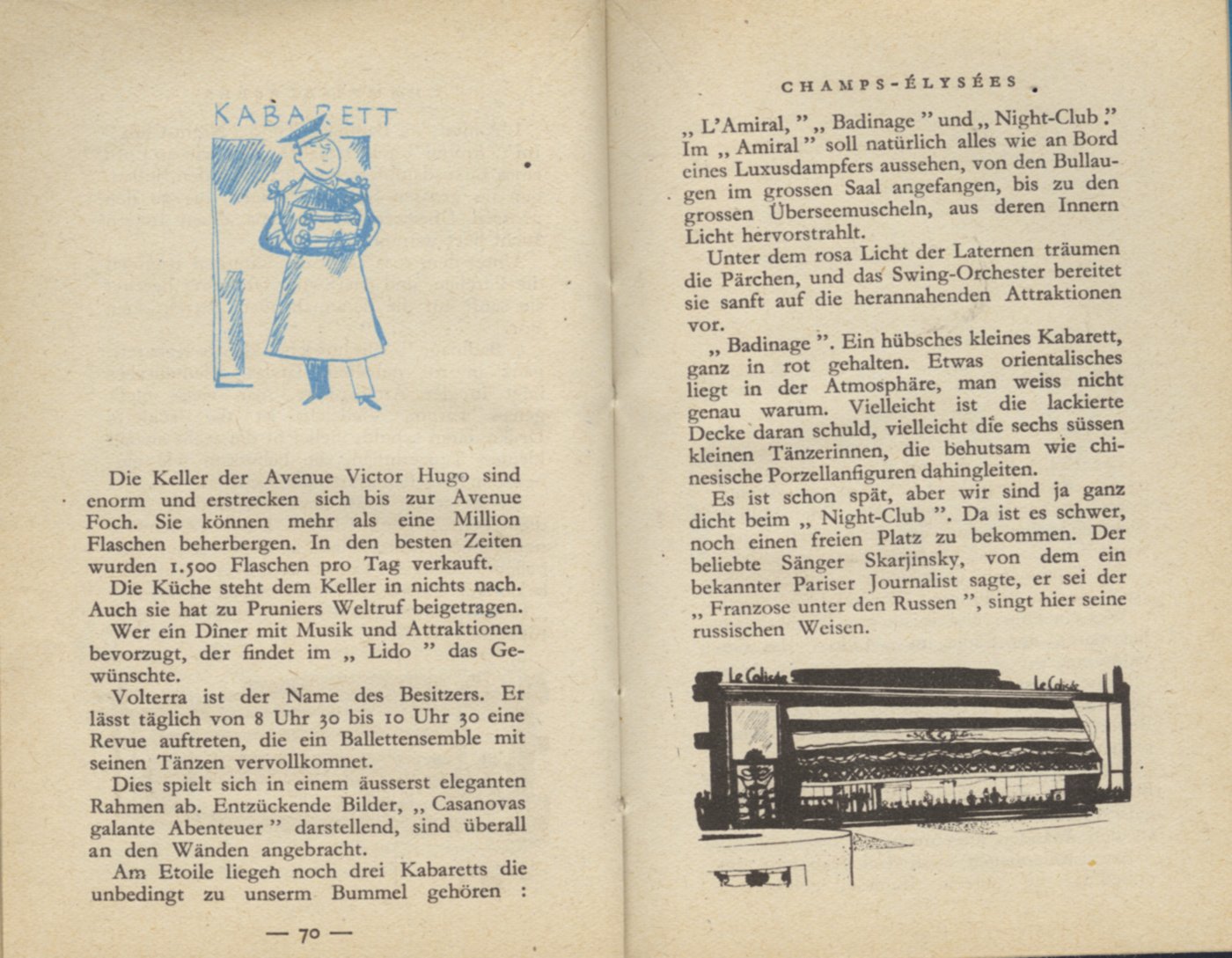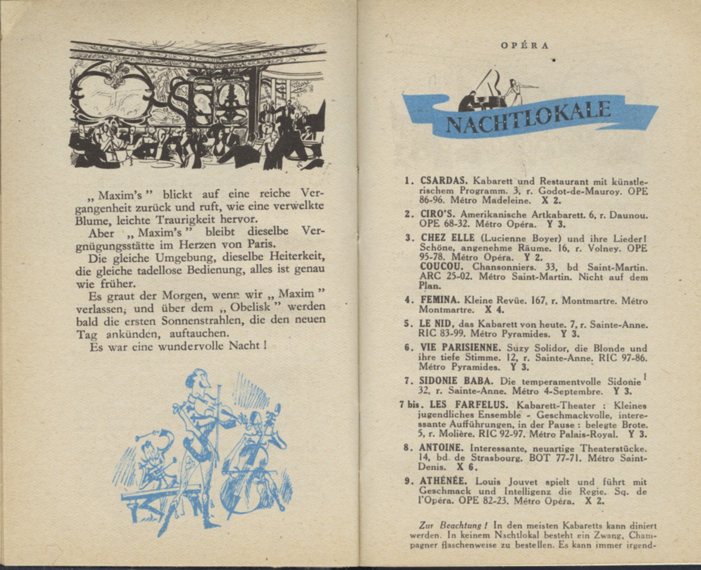 D’un format pratique (9×14 cm), il se range dans la poche de veste de tout officier teuton qui se respecte. Il est bien protégé par son rhodoïd qui lui promet une longue durée de vie et le protège des intempéries comme du champagne ou autre substance liquide. Il est découpé par arrondissement, propose un plan du métro, les adresses des lieux nocturnes avec une petite description (j’ignorais qu’il y avait autant d’établissement à l’ambiance russe à l’époque), un lexique pour comprendre les menus et même une partie dans laquelle vous pouvez recueillir les dédicaces de Fernandel, Charles Trenet ou Arletty (malheureusement, mon exemplaire n’en contient aucune).