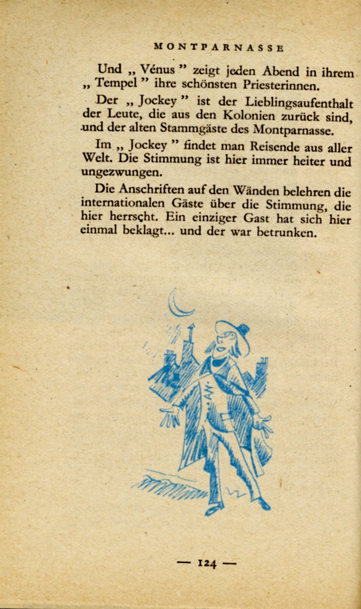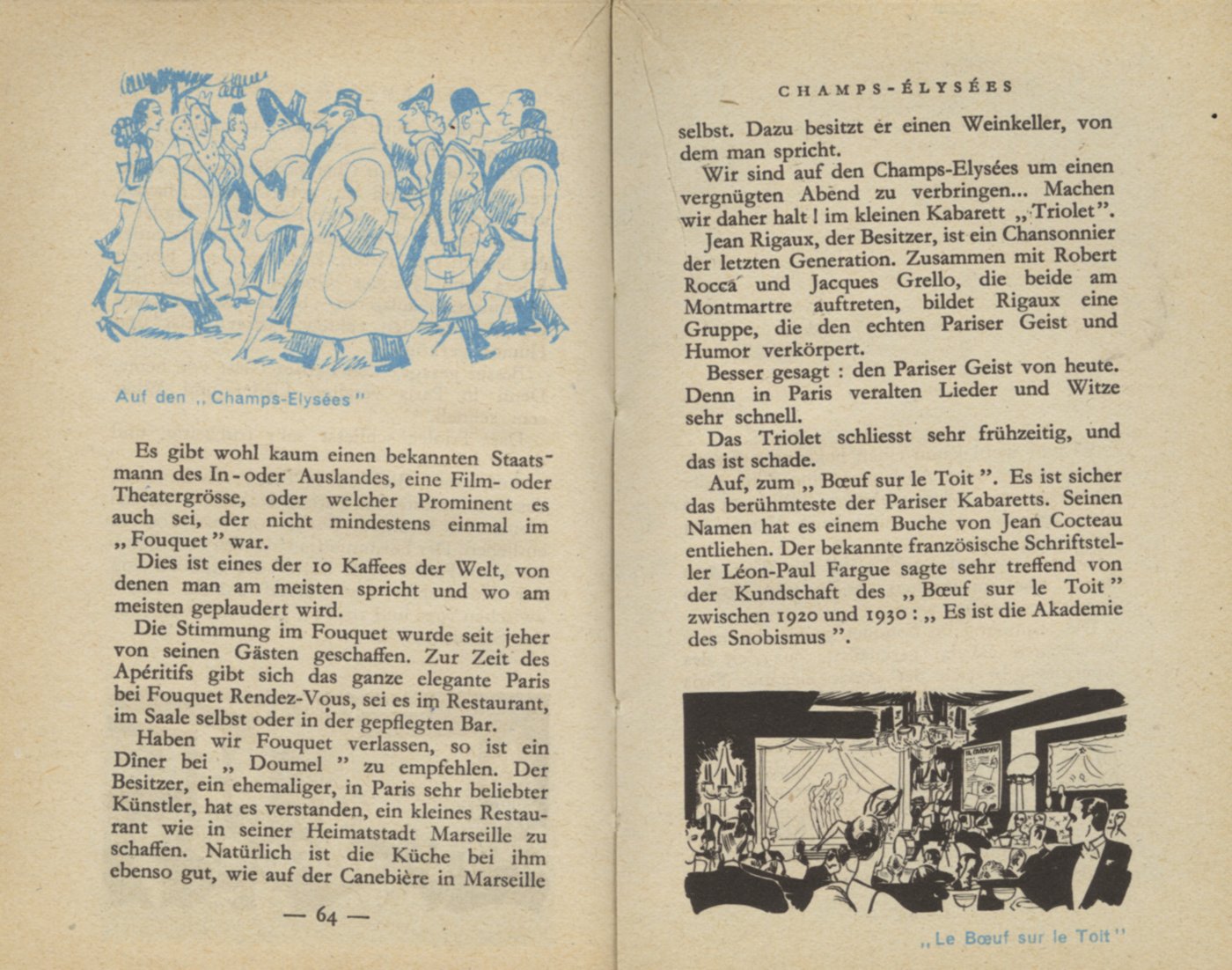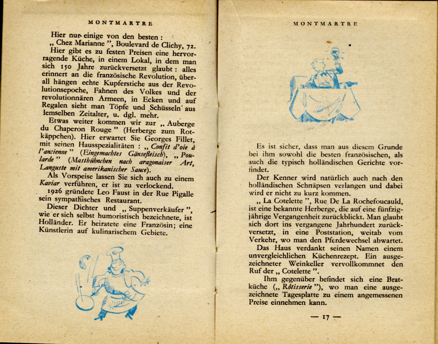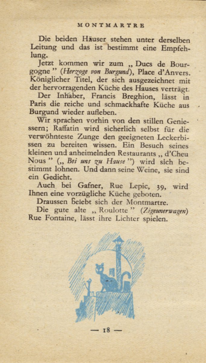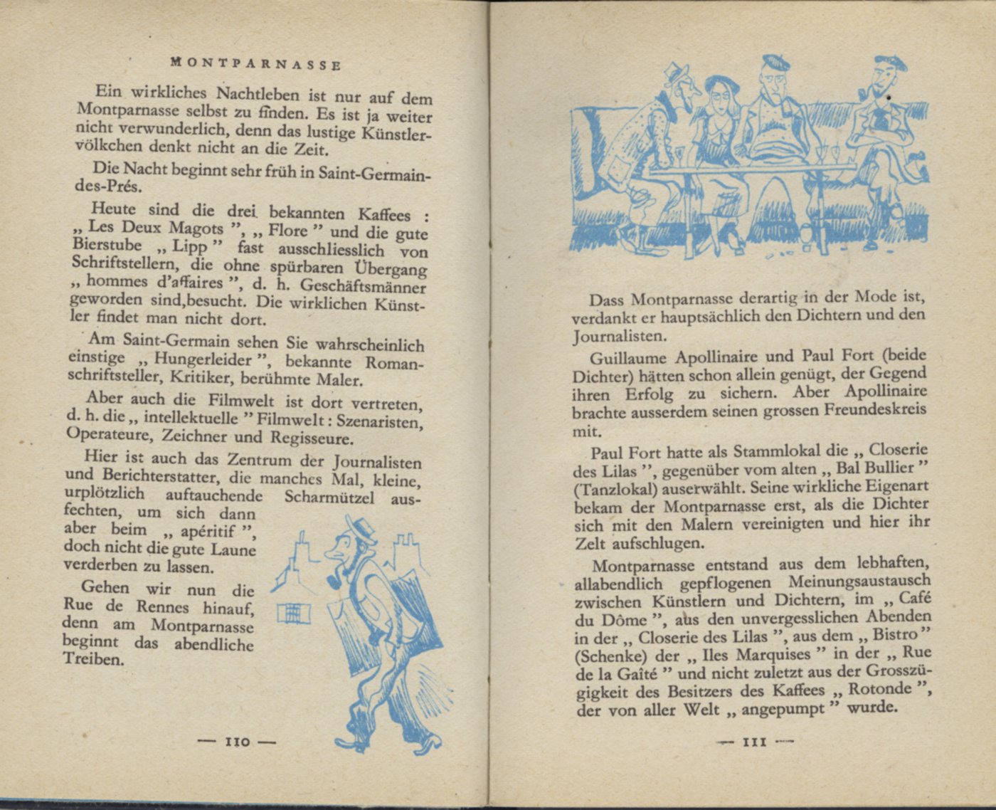 D’un format pratique (9×14 cm), il se range dans la poche de veste de tout officier teuton qui se respecte. Il est bien protégé par son rhodoïd qui lui promet une longue durée de vie et le protège des intempéries comme du champagne ou autre substance liquide. Il est découpé par arrondissement, propose un plan du métro, les adresses des lieux nocturnes avec une petite description (j’ignorais qu’il y avait autant d’établissement à l’ambiance russe à l’époque), un lexique pour comprendre les menus et même une partie dans laquelle vous pouvez recueillir les dédicaces de Fernandel, Charles Trenet ou Arletty (malheureusement, mon exemplaire n’en contient aucune).