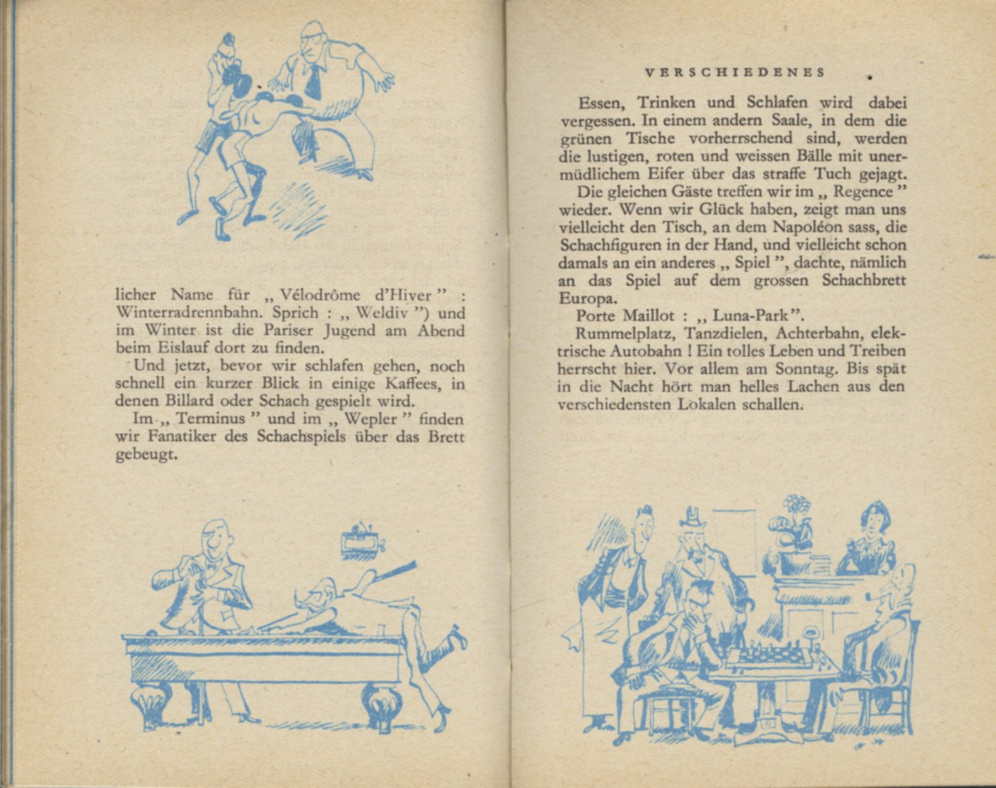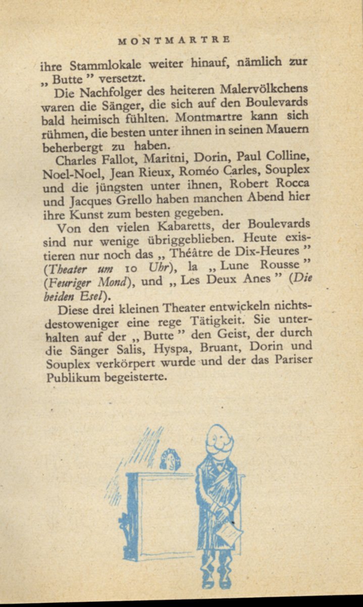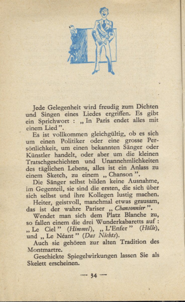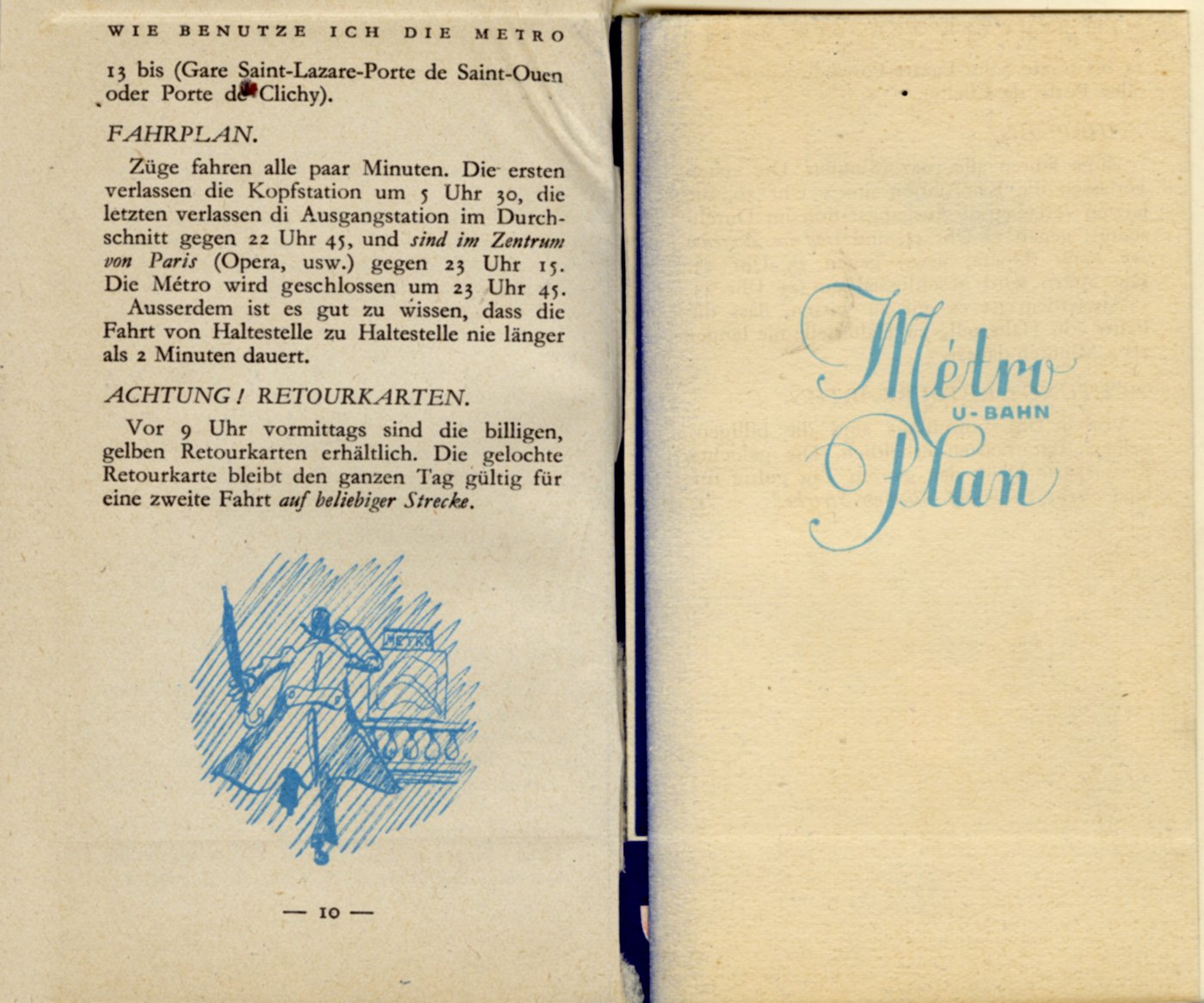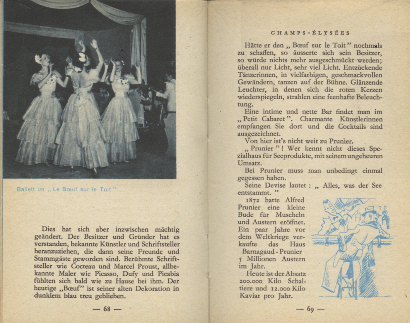 D’un format pratique (9×14 cm), il se range dans la poche de veste de tout officier teuton qui se respecte. Il est bien protégé par son rhodoïd qui lui promet une longue durée de vie et le protège des intempéries comme du champagne ou autre substance liquide. Il est découpé par arrondissement, propose un plan du métro, les adresses des lieux nocturnes avec une petite description (j’ignorais qu’il y avait autant d’établissement à l’ambiance russe à l’époque), un lexique pour comprendre les menus et même une partie dans laquelle vous pouvez recueillir les dédicaces de Fernandel, Charles Trenet ou Arletty (malheureusement, mon exemplaire n’en contient aucune).