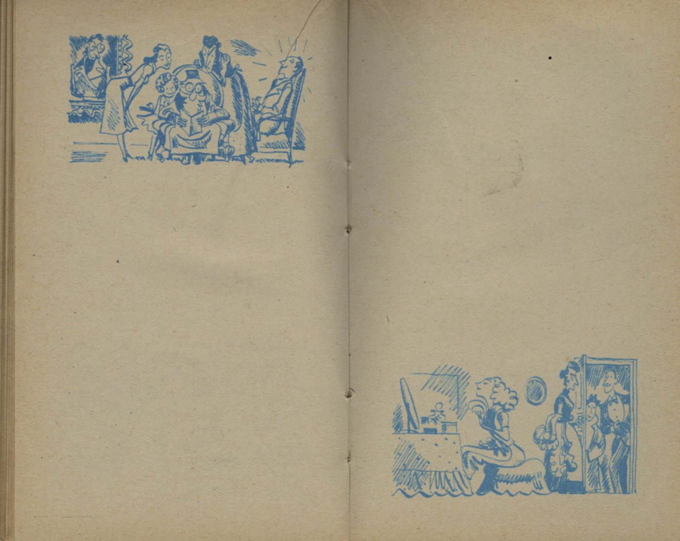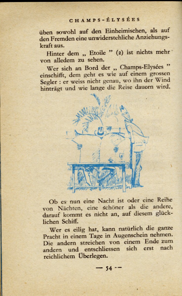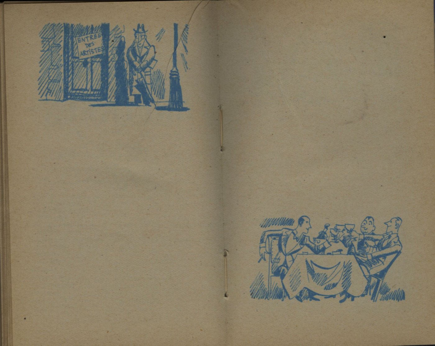 Beuville a réalisé un paquet de petits dessins à teneur humoristique pour ce guide, reproduits en blanc et bleu, ce qui n’aide pas trop vu la taille des images. J’ai scanné des pages entières pour donner un aperçu du carnet et vous remarquerez des illustrations représentant les façades de différents établissements, mais vus de nuit. Une idée assez géniale, à mon avis.